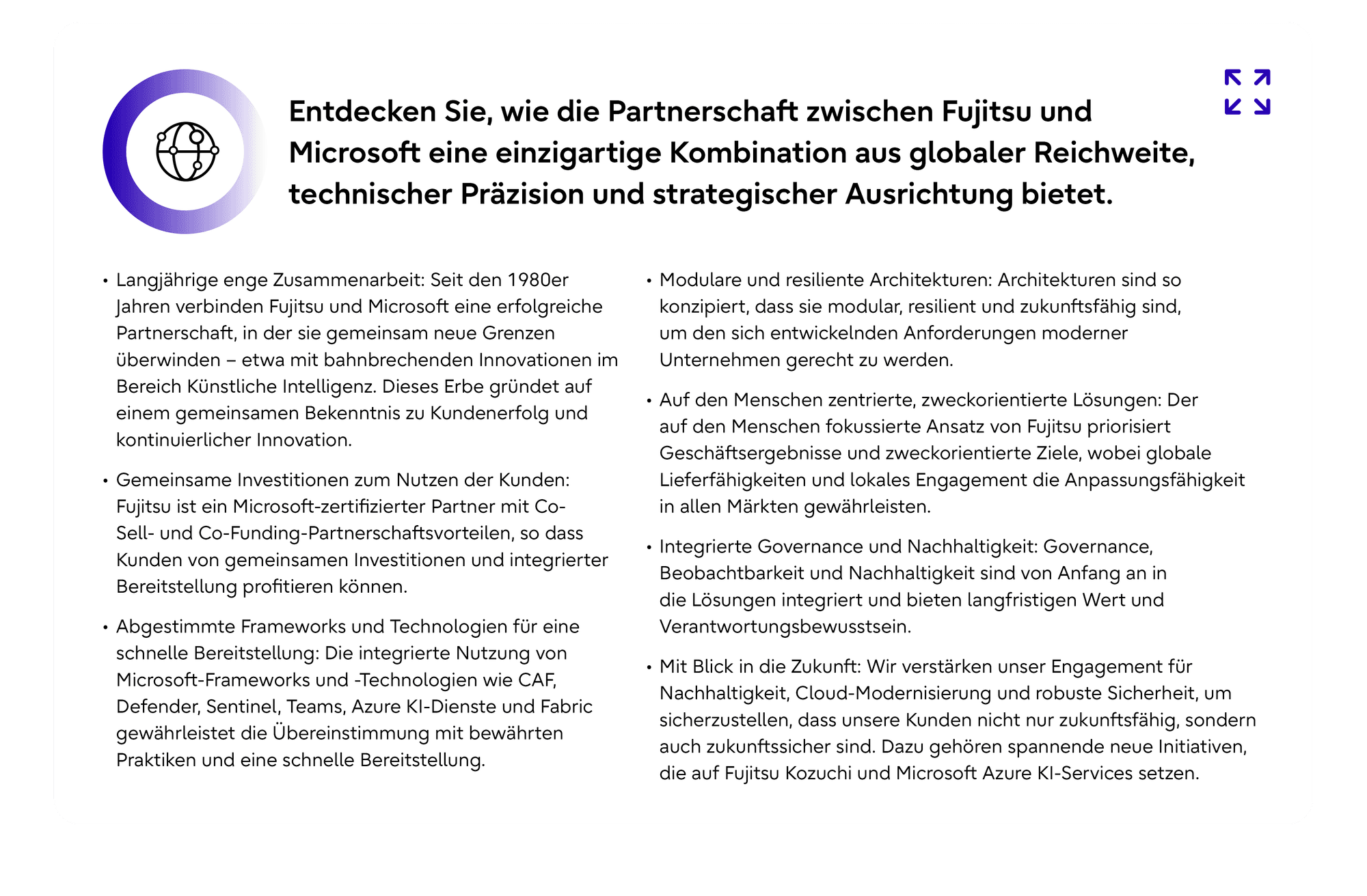 Hinter jeder erfolgreichen Cloud-Transformation steckt die Stärke ihrer Partnerschaften. Die Fujitsu-Microsoft-Allianz vereint tiefgreifende technische Integration, Co-Investment-Modelle und gemeinsame Frameworks, um Unternehmensergebnisse zu beschleunigen. Darüber hinaus ist es die Geschichte einer gemeinsamen Vision und unermüdlicher Innovation, die einzigartig positioniert ist, um sichere, skalierbare und nachhaltige Innovationen in großem Maßstab zu liefern.